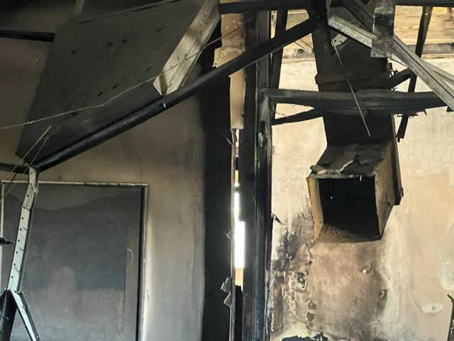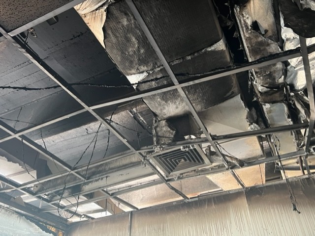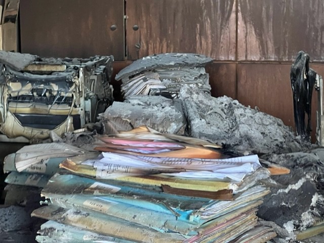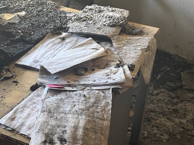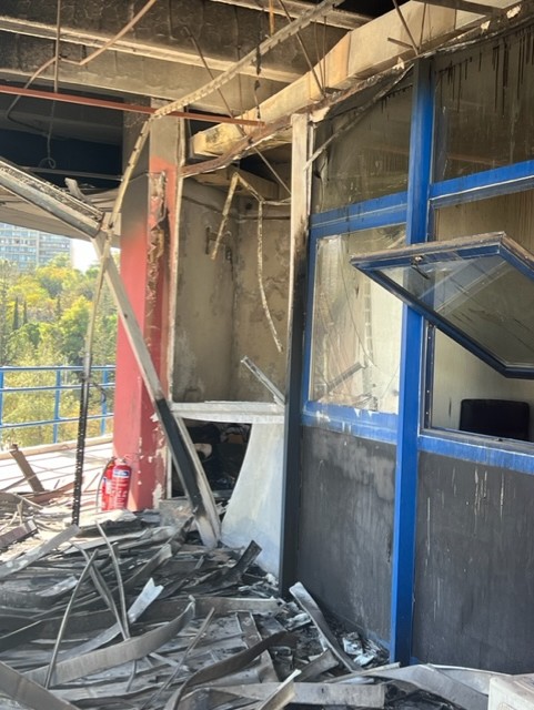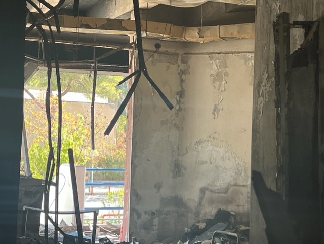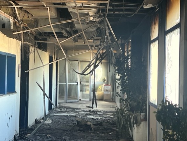 Στο σκληρό φως του πρωινού η καταστροφή έμοιαζε ακόμα πιο ωμή και απροκάλυπτη. Οι τοίχοι κατάμαυροι, καλώδια κρέμονταν, σίδερα λύγισαν, τζάμια έσπασαν, λαμαρίνες άνοιξαν σαν βεντάλια, υπολογιστές έγιναν κάρβουνο.