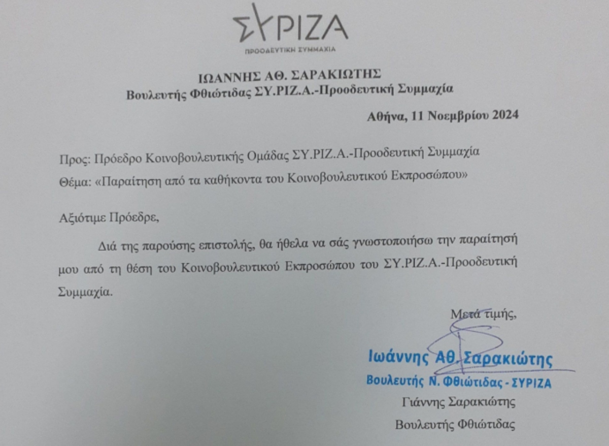 Ο βουλευτής Φθιώτιδας του ΣΥΡΙΖΑ, Γιάννης Σαρακιώτης, ανακοίνωσε την παραίτηση του από τις θέσεις ευθύνης του κόμματος και πιο συγκεκριμένα από κοινοβουλευτικός εκπρόσωπος.
