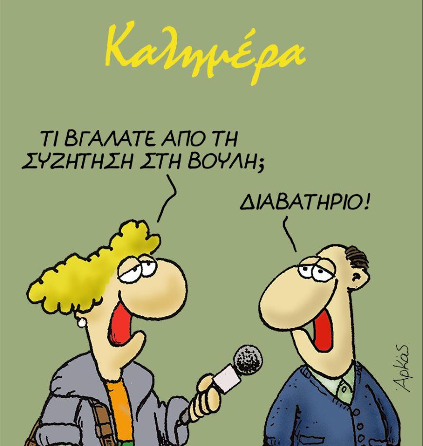 Ο διάσημος καλλιτέχνης με το σημερινό του σκίτσο προκαλεί το γέλιο και ταυτόχρονα ασκεί κριτική για τα όσα διαδραματίζονται καθημερινά στο Ελληνικό Κοινοβούλιο.