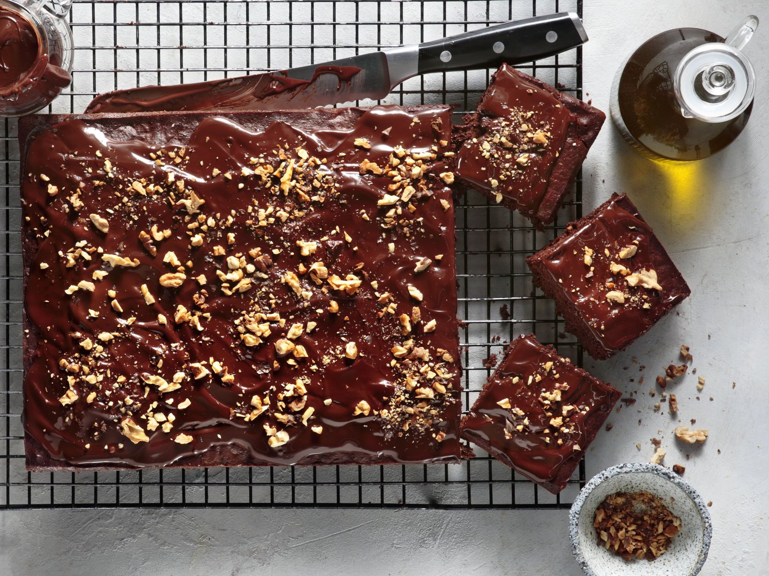 Ετοιμάζουμε το γλάσο: Λιώνουμε την κουβερτούρα στο φούρνο μικροκυμάτων ή σε μπεν μαρί και ανακατεύουμε μέσα το ελαιόλαδο. Περιχύνουμε με το μείγμα το κέικ και στη συνέχεια το πασπαλίζουμε με τα τριμμένα καρύδια.