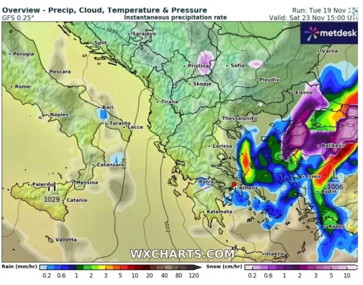Η πρόβλεψη του αμερικανικού μοντέλου GFS δίνει χιόνια κυρίως στη βορειοδυτική Ελλάδα το Σάββατο 23/11. Πιθανότητα χιονοπτώσεων υπάρχει ακόμα για τα νησιά του βορειοανατολικού Αιγαίου, με τη Λήμνο να βρίσκεται στο επίκεντρο.