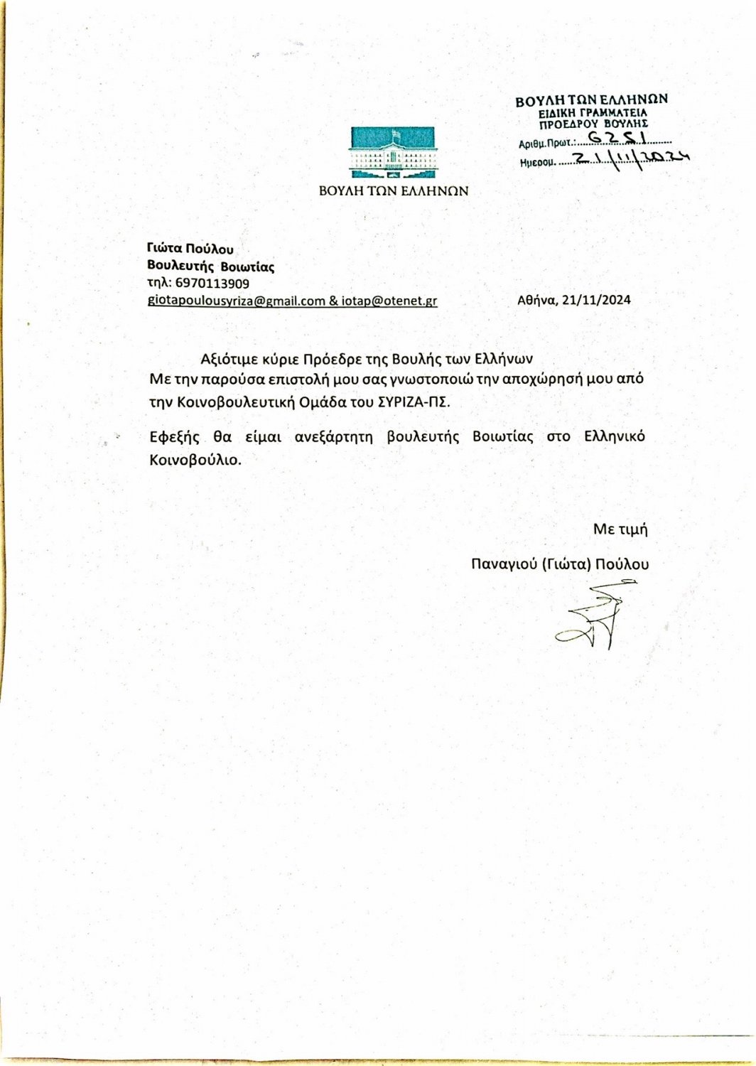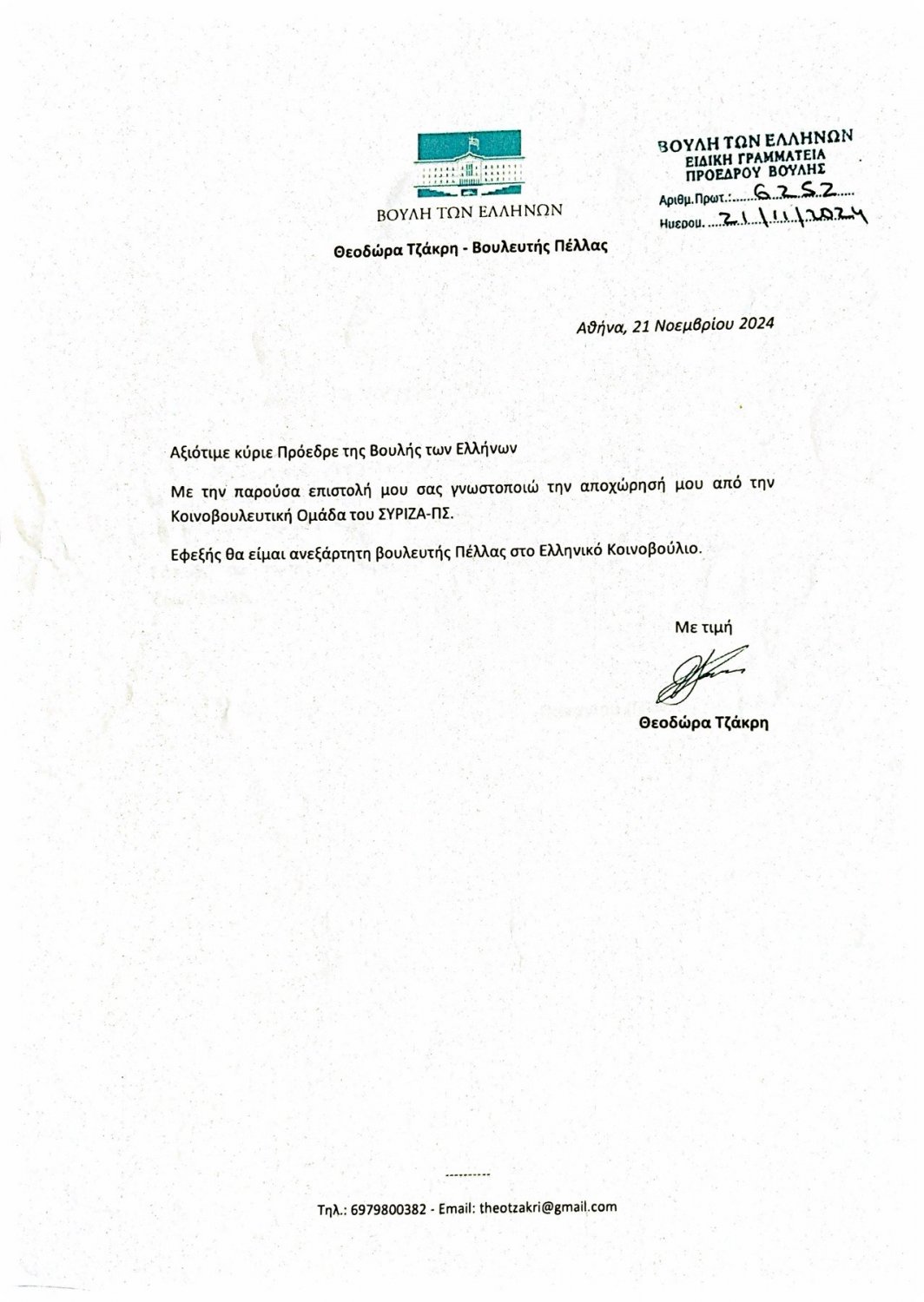 Ανεξαρτητοποιήθηκαν από τον ΣΥΡΙΖΑ το πρωί της Πέμπτης 21/11 οι βουλευτές Γιώτα Πούλου και Θεοδώρα Τζάκρη, όπως είχαν προαναγγείλει με επιστολές που απέστειλαν στον Πρόεδρο της Βουλής, Κώστα Τασούλα.