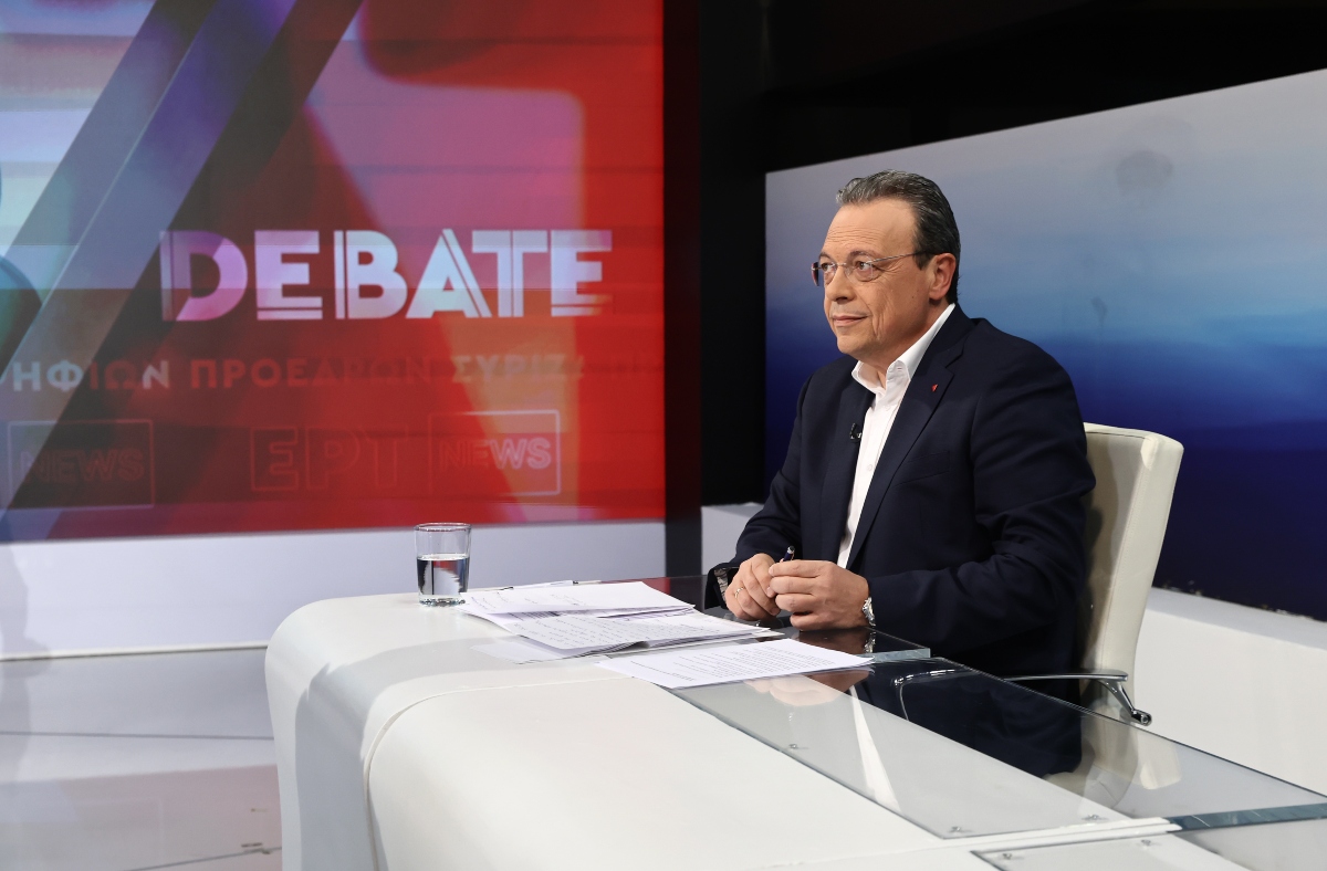 Οι τέσσερις διεκδικητές του χρίσματος είχαν χωριστεί σε δυάδες. Από τη μία ο Απόστολος Γκλέτσος και ο Παύλος Πολάκης, από την άλλη ο Σωκράτης Φάμελλος κι ο Νικόλας Φαραντούρης. Καθισμένοι σε δύο πάλλευκα -φουτουριστικής αισθητικής- τραπέζια, υποτίθεται πως είχαν ανάμεσά τους δύο συντονιστές της βραδιάς: τη Χριστίνα Βίδου και τον Απόστολο Μαγγηριάδη. Όχι πως πέρασαν απαρατήρητοι οι δύο δημοσιογράφοι της δημόσιας τηλεόρασης. Απλώς ο Στέφανος Κασσελάκης, ως ένα πνεύμα ή και φάντασμα που τους στοιχειώνει, είχε εισβάλει και φωλιάσει στο στούντιο.
