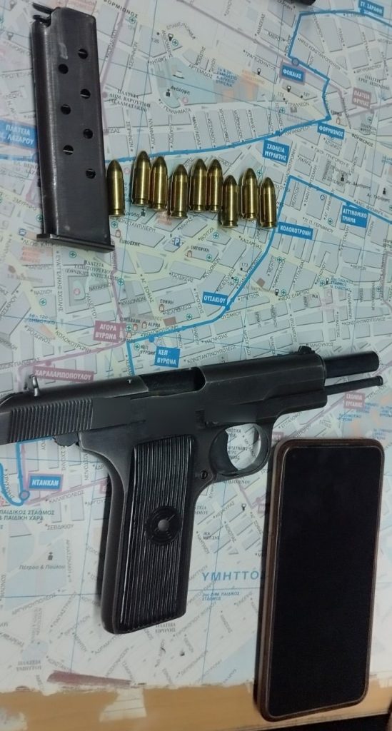 Ο 22χρονος συνοδηγός κατά τη διαφυγή του πέταξε επί του οδοστρώματος πιστόλι με 9 φυσίγγια, ενώ οι αστυνομικοί μετά από πεζή καταδίωξη τον ακινητοποίησαν και τον οδήγησαν στο Τμήμα Ασφαλείας Βύρωνα.