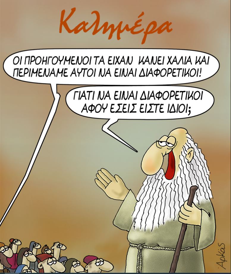 Πολιτική «καλημέρα» μάς απευθύνει ο Αρκάς και ασκεί σκληρή κριτική για τα πολιτικά πεπραγμένα στη χώρα μας και τον τρόπο που οι πολίτες μετέχουμε σε αυτά.  Ο σκιτσογράφος επιστρατεύει τον σοφό προφήτη του και μάς καλημερίζει με ένα μήνυμα  όλο  ψόγο για τον τρόπο που ως πολίτες αντιμετωπίζουμε την πολιτική και την εκλογική διαδικασία.