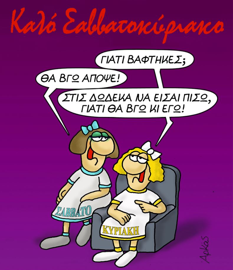 Ο σκιτσογράφος σε μοβ φόντο απεικονίζει το Σάββατο και την Κυριακή να κάθονται σε μια πολυθρόνα και να συνομιλούν.