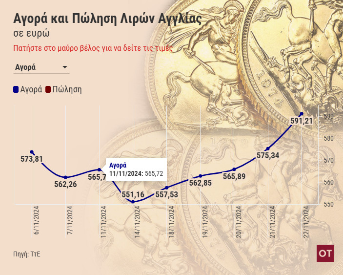 Την Παρασκευή (22/11) η επίσημη τιμή της χρυσής λίρας που δίνει η Τράπεζα της Ελλάδος, είχε φθάσει στα 692,90 για αγορά και στα 591,21 ευρώ για την πώληση της.