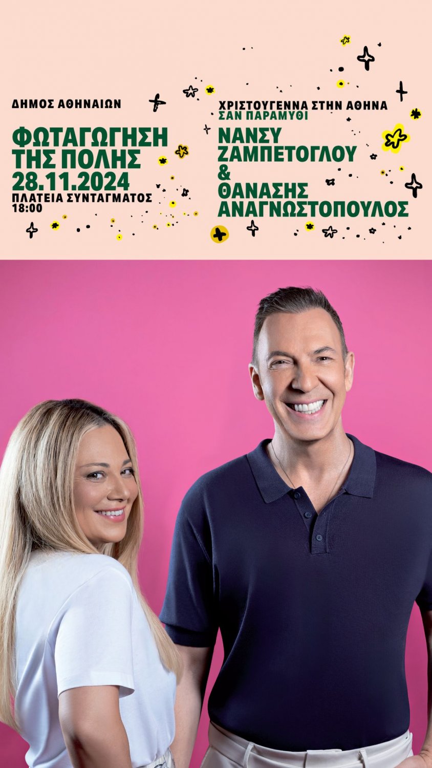 H «αφήγηση» του αθηναϊκού παραμυθιού των Χριστουγέννων αρχίζει από τη λαμπερή σκηνή της Πλατείας Συντάγματος, με ένα ιδιαίτερα αγαπητό και επιτυχημένο δίδυμο, τη Νάνσυ Ζαμπέτογλου και τον Θανάση Αναγνωστόπουλο.