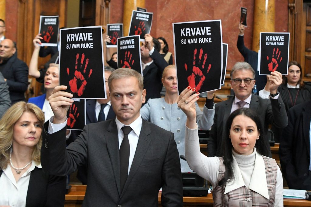 Με την έναρξη της συνεδρίασης, στελέχη της αντιπολίτευσης σήκωσαν πλακάτ με ματωμένα χέρια, ενώ φώναζαν «Δολοφόνοι, δολοφόνοι».