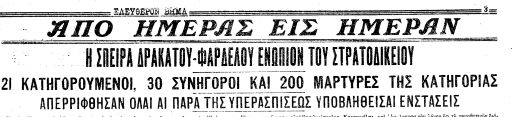 »Διαρκούσης της συνεργασίας ταύτης προσήλθον ο διοικητής του α’ σώματος στρατού κ. Τσερούλης, ο διευθυντής του δικαστικού κ. Μπουφίδης και ο διευθυντής της στρατιωτικής δικαιοσύνης κ. Ανανιάδης. Οι δύο τελευταίοι συνηγόρησαν και αυτοί υπέρ της διατυπωθείσης ευχής του στρατοδικείου».