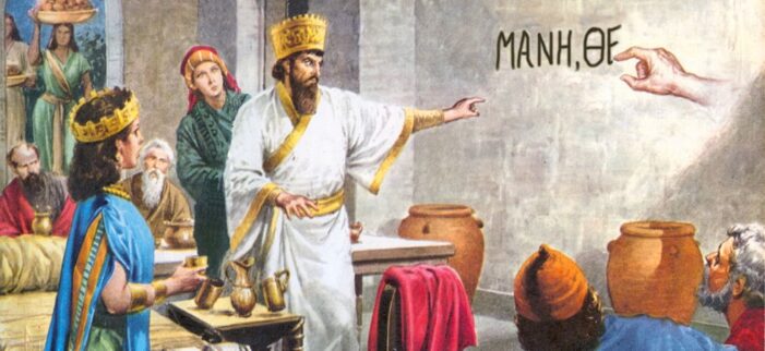 Τότε είχα σκεφτεί, μεταφέροντας από την Παλαιά Διαθήκη το χωρίο από το βιβλίο «Δανιήλ» (Ε, 11-13) όπου ο εβραίος αιχμάλωτος του Μπαλταζάρ στη Βαβυλώνα ερμηνεύει τη φράση στον τοίχο που προμηνύει την καταστροφή της Αυτοκρατορίας (το περίφημο «Μανή, θεκέλ, φάρες» που γράφτηκε από το χέρι του Θεού), να μιλήσω μέσα από το θέατρο για τη δύση της υπερδύναμης: τη “δύση της Δύσης” όπως συνόψισα το πιο βαθύ, το σκοτεινό που δεν το πιάνει η ανάλυση. Δεν τα κατάφερα διότι όλος ο κόσμος δεν είναι μία σκηνή αλλά μια μπίζνα.