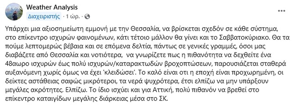Σε χάρτη, που δημοσίευσε στο Facebook, αναφέρει: «Η ατμοσφαιρική κυκλοφορία των επόμενων ημερών με το ατμοσφαιρικό βουνό (μπλε καμπύλη) να βρίσκεται τώρα πάνω από τη χώρα μας, προς το Σαββατοκύριακο όμως θα μετακινηθεί προς τα δυτικά – βορειοδυτικά τμήματα της Ευρώπης για να ανοίξει ο δρόμος και να κινηθεί προς την περιοχή μας ένα οργανωμένο κύμα κακοκαιρίας (γράμμα “Χ”) συνοδευόμενο και από πολική αέρια μάζα (μπλε αποχρώσεις)».