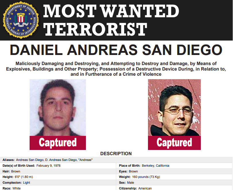 Ο Σαν Ντιέγκο κατηγορείται για την έκρηξη βόμβας στην εταιρεία βιοτεχνολογίας Chiron Inc, κοντά στο Όκλαντ της Καλιφόρνιας, τον Αύγουστο του 2003. Μια δεύτερη βόμβα είχε εξουδετερωθεί από πυροτεχνουργούς. Οι αρχές τον είχαν κατηγορήσει επίσης για τοποθέτηση βόμβας σε άλλη εταιρεία της Καλιφόρνιας, έναν μήνα αργότερα. Δεν είχαν αναφερθεί τραυματισμοί σε αυτές τις επιθέσεις.