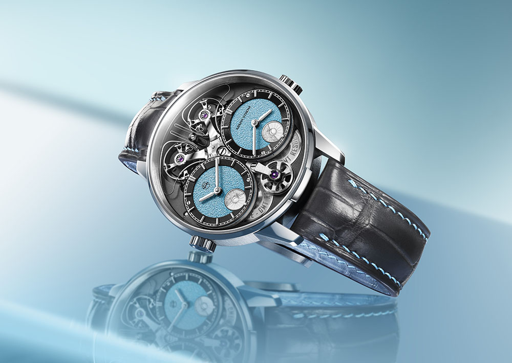 Συνεχίζω με την ανεξάρτητη Armin Strom και το Dual Time GMT Resonance, μια άκρως εντυπωσιακή επετειακή επανέκδοση του προ δεκαπενταετίας Master One. Θεαματικές η πλήρης επανασχεδίαση και μελέτη για να χωρέσει ένας τόσο ογκώδης και πολύπλοκος, σε απόλυτη διαφάνεια, μηχανισμός σε μια στρογγυλή κάσα με την απίστευτη διάμετρο των μόλις 39 χιλιοστών και το πάχος κάτω των 10 χιλιοστών! Αποτέλεσμα, ένα ευκολοφόρετο και κομψότατο στον καρπό μοναδικό ρολόι. Η σχεδίαση και η αισθητική του εξίσου υπέροχες, με τα διπλά γαλάζια καντράν ένδειξης διαφορετικής ώρας και λεπτών στη θέση 6 και ημέρας/νύχτας.