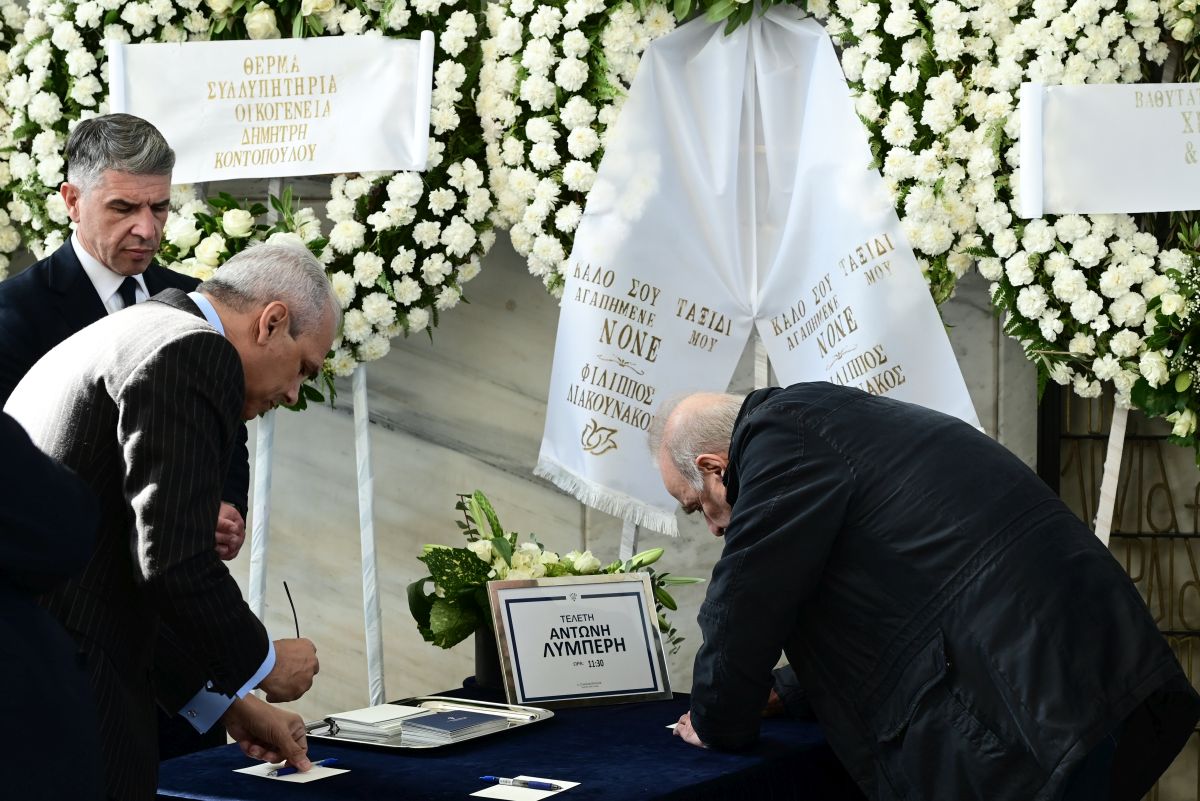 Η οικογένεια, οι συγγενείς και οι φίλοι του εκδότη και επιχειρηματία Αντώνη Λυμπέρη τον αποχαιρετούν στο Α’ Νεκροταφείο Αθηνών.