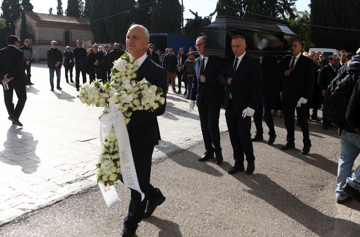 Η σύζυγός του Έλενα Μακρή έφτασε υποβασταζόμενη από τα τρία τους παιδιά, ενώ στο στεφάνι που υπάρχει στο φέρετρο αναγράφεται το μήνυμα «Στον μαχητή μου».