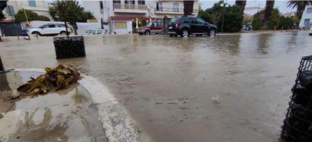 Δύσκολη η κατάσταση και στην πρωτεύουσα του νησιού, τη Μύρινα καθώς το ποτάμι έχει υπερχειλίσει και έχει πλημμυρίσει η λεωφόρος Δημοκρατίας.