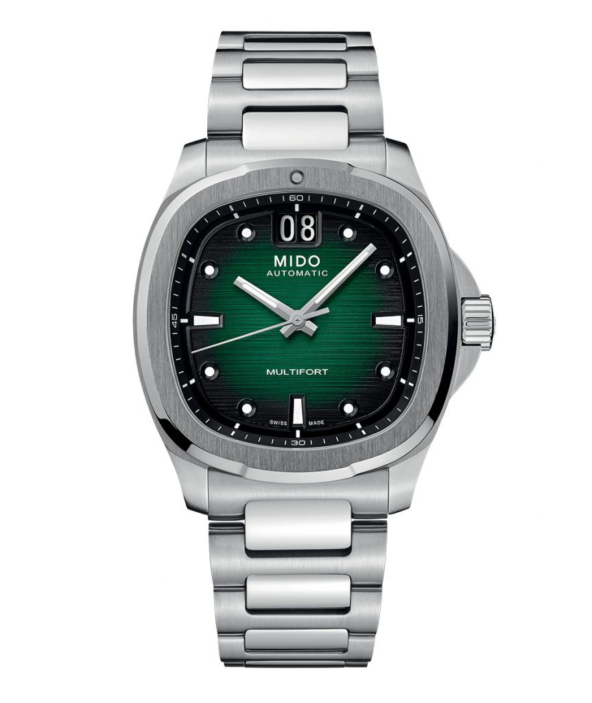 Παράδειγμα το νέο αυτό μέλος της οικογένειας Multifort TV Big Date, που έχει τετραγωνισμένη κάσα 40 mm από ανοξείδωτο ατσάλι, ατσάλινο ενσωματωμένο μπρασελέ, πράσινο ντεγκραντέ καντράν και αυτόματο μηχανισμό με 80 ώρες ενεργειακής αυτονομίας. Τιμή: €1.200