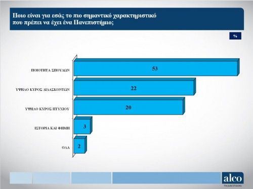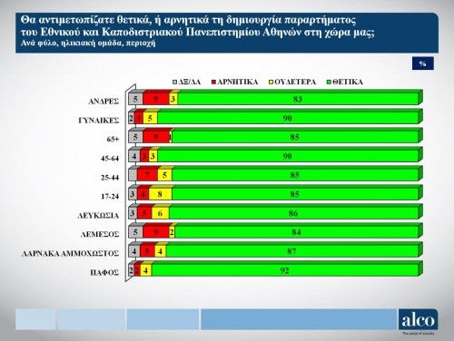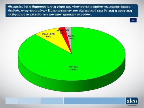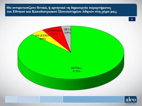 Την ίδια ώρα η δημοσκόπηση που πραγματοποίησε η ALCO δείχνει την ξεκάθαρη προτίμηση της κοινής γνώμης. Η συντριπτική πλειοψηφία έχει τεθεί υπέρ της δημιουργίας παραρτημάτων από διεθνώς αναγνωρισμένα πανεπιστήμια, όμως είναι φυσικά το ΕΚΠΑ.