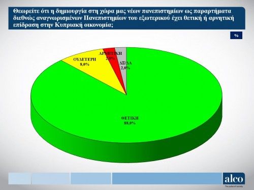 Το ίδιο θετική (88%) είναι και η πεποίθηση ότι αυτή η δημιουργία παραρτημάτων διεθνώς αναγνωρισμένων πανεπιστημίου του εξωτερικού θα έχει θετική επίδραση στην Κυπριακή οικονομία.