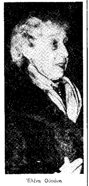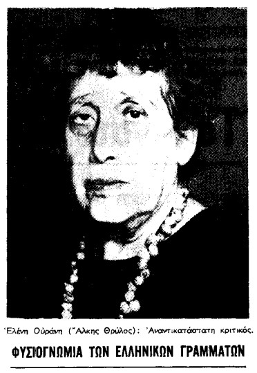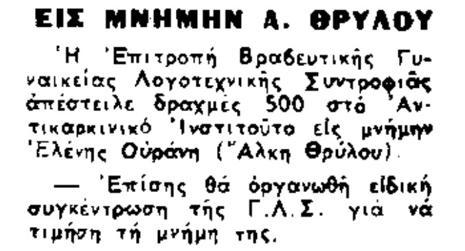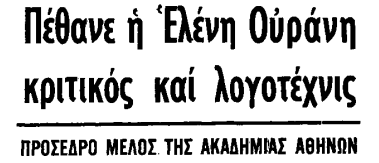 «Πέθανε χθες το πρωί, σε ηλικία 75 ετών, από ανίατη ασθένεια, η γνωστή κριτικός και συγγραφεύς Ελένη Ουράνη (Άλκης Θρύλος). Η Ε. Ουράνη νοσηλευόταν προσφάτως στην Γενική Κλινική Αθηνών».
