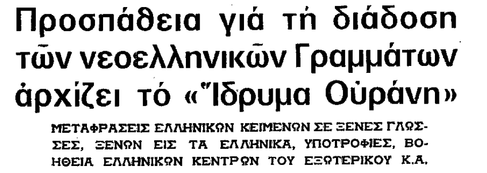 »Πρόκειται για το έργο, που άρχισε ήδη και ολοκληρώνεται σιγά σιγά του Ιδρύματος “Κώστα και Ελένης Ουράνη”, το οποίο έχει συσταθή από την διαθήκη της Ελένης Ουράνη (“Άλκη Θρύλου”), που πέθανε τον Δεκέμβριο του 1971, εγκαταλείποντας όλη την κινητή και την ακίνητη περιουσία της στην Ακαδημία Αθηνών.