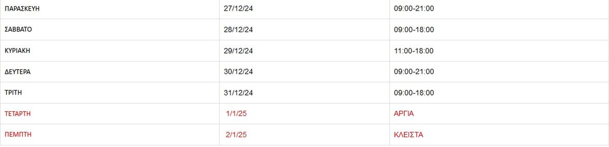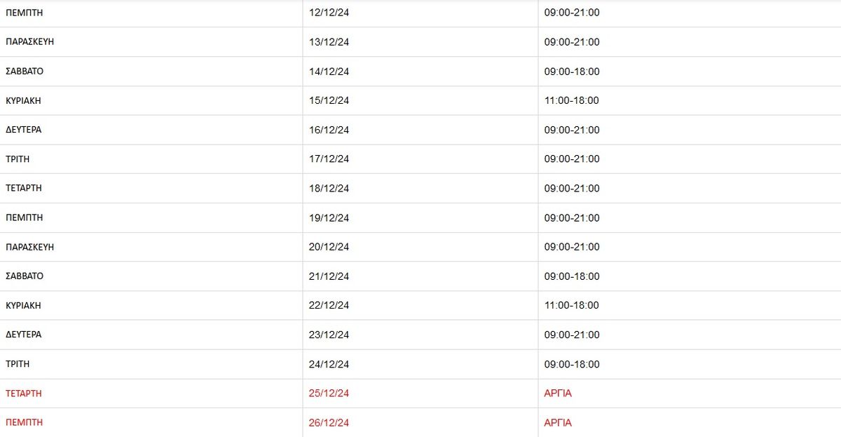 Τα καταστήματα θα είναι κλειστά ανήμερα των Χριστουγέννων και στις 26/12, την 1/1 και στις 2/1.