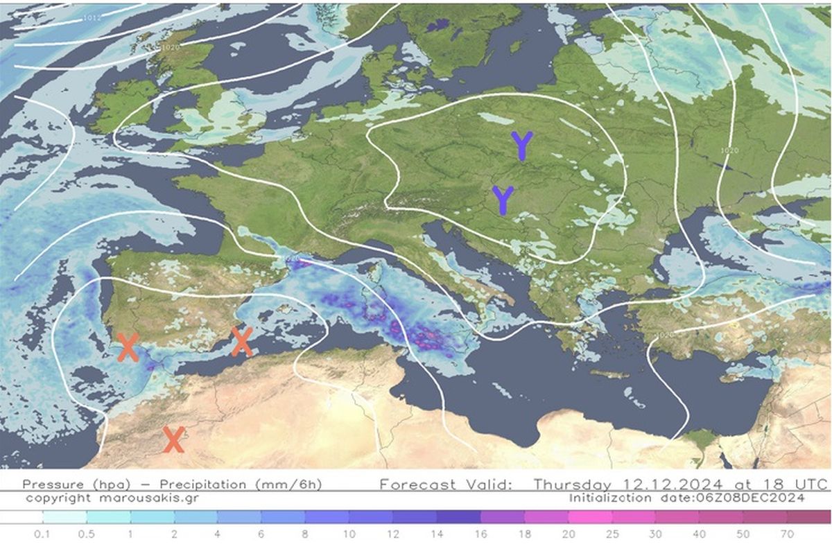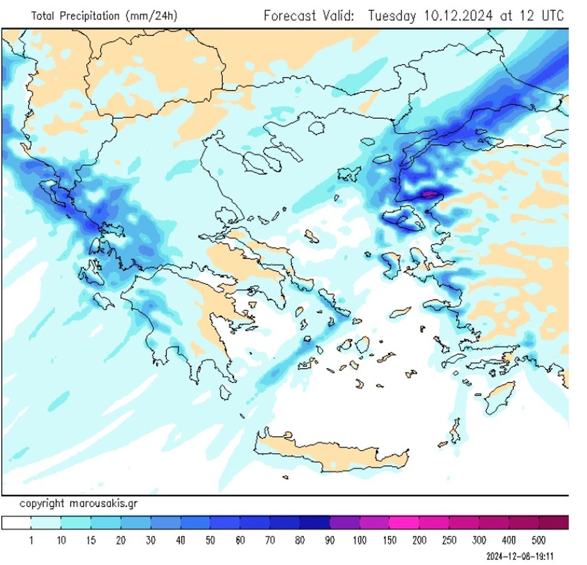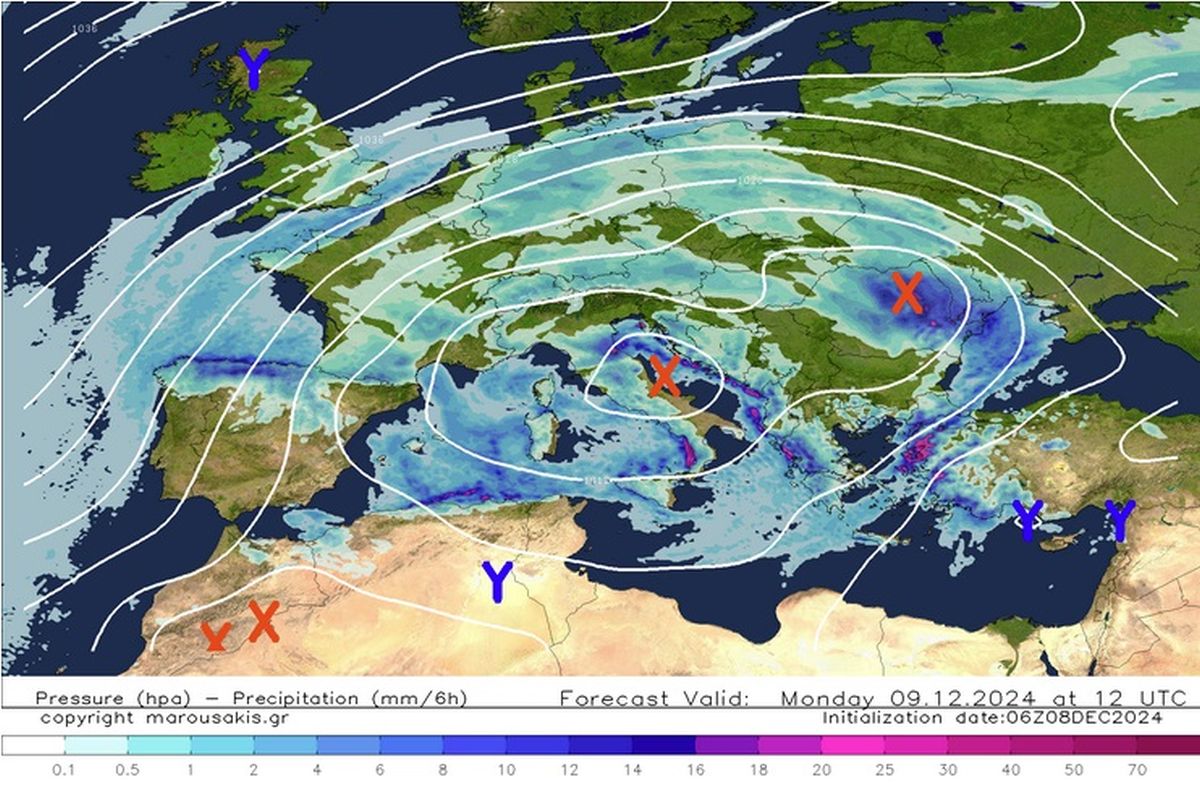 Σύμφωνα με τον Κλέαρχο Μαρουσάκη «εκτεταμένο σύστημα χαμηλών βαρομετρικών πιέσεων στην περιοχή της Ιταλίας θα ωθεί κύματα βροχών και καταιγίδων προς τη χώρα μας μέχρι και τα μέσα της εβδομάδας, με τους νοτιάδες στις θάλασσες να φτάνουν τα 6-7 μποφόρ».