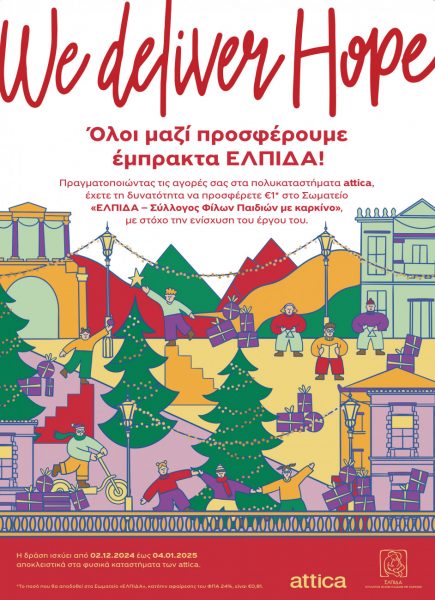 Τα πολυκαταστήματα attica και το Σωματείο «ΕΛΠΙΔΑ – Σύλλογος Φίλων Παιδιών με καρκίνο», ανακοινώνουν τη σύμπραξή τους, στο πλαίσιο υλοποίησης της πρωτοβουλίας “We deliver Hope”, με στόχο την ενίσχυση του έργου του Σωματείου «ΕΛΠΙΔΑ». Η έναρξη της δράσης σηματοδοτήθηκε με τη διοργάνωση εκδήλωσης στο attica Golden Hall, τη Δευτέρα 9 Δεκεμβρίου, παρουσία μελών του Σωματείου, σημαντικών προσκεκλημένων των attica, καθώς και εκπροσώπων των Μέσων Μαζικής Ενημέρωσης.
