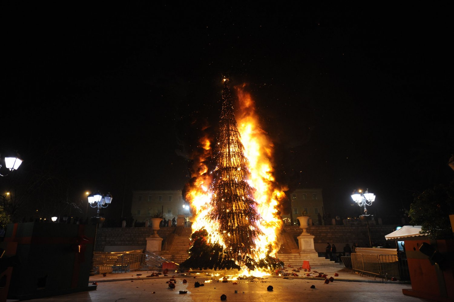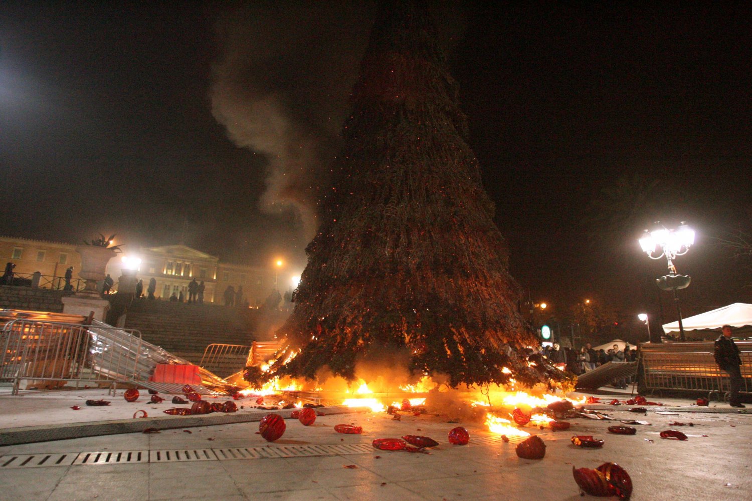 Το χριστουγεννιάτικο δέντρο της πλατείας Συντάγματος παραδόθηκε στις φλόγες. Η εικόνα του φλεγόμενου δέντρου έκανε τον γύρο του κόσμου και έγινε ακόμη και πρωτοσέλιδο στους New York Times.