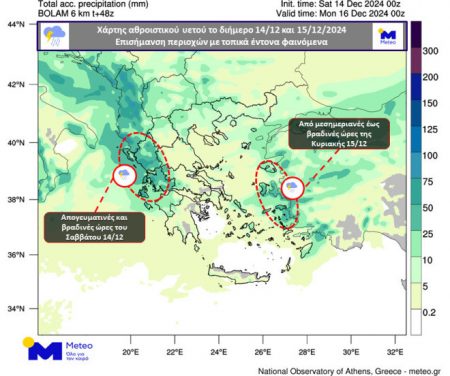 Εκτιμώμενο αθροιστικό ύψος βροχής σε χιλιοστά από το Σάββατο 14/12 έως και την Κυριακή 15/12/2024 (48 ώρες συνολικά), όπως υπολογίζεται από το αριθμητικό μοντέλο πρόγνωσης καιρού του Εθνικού Αστεροσκοπείου Αθηνών / meteo.g.
