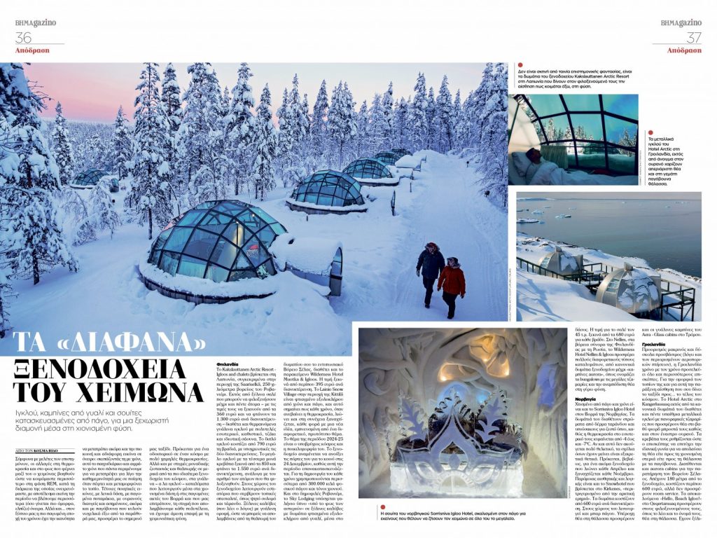 Ακόμα, ταξιδεύουμε στα πλέον ξακουστά, «διάφανα» ξενοδοχεία του χειμώνα που προσφέρουν από διαμονή σε ιγκλού μέχρι σουίτες κατασκευασμένες από πάγο.