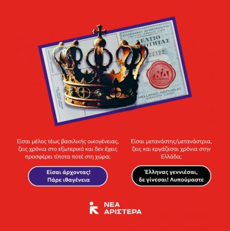 Με σκωπτικό τρόπο σχολιάζει η Νέα Αριστερά την απόδοση ιθαγένειας στα μέλη της τέως Βασιλικής οικογένειας καθώς όπως λένε γίνεται σε αντιπαραβολή με τις παράλογες προϋποθέσεις και εξωφρενικές διαδικασίες στις οποίες υποβάλλονται δεκάδες χιλιάδες άνθρωποι που ζουν και εργάζονται για δεκαετίες στην Ελλάδα.