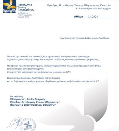 Όπως εξηγεί ο κ. Βάλλης, οι γυναίκες ναυτικοί δικαιούνται μόλις έξι μήνες επίδομα μητρότητας, ενώ η πρόταση της Ένωσης είναι να αυξηθεί στους εννέα μήνες, όπως ισχύει για τις γυναίκες στον δημόσιο και ιδιωτικό τομέα, αλλά και για τις αγρότισσες.