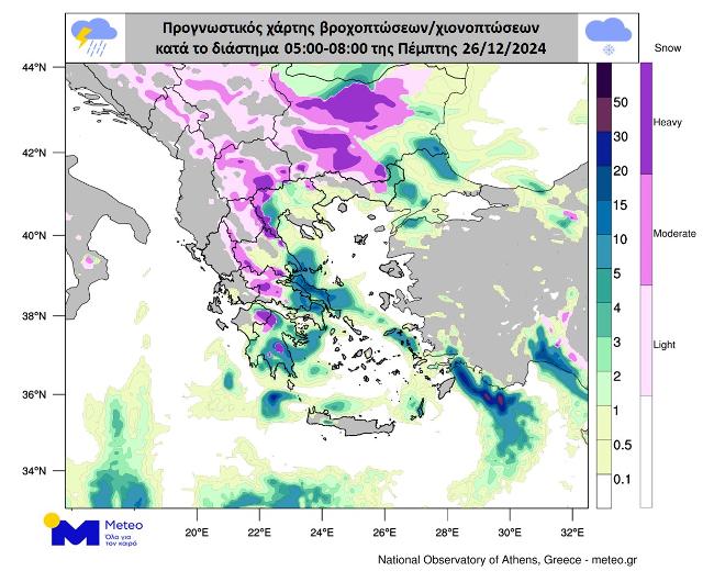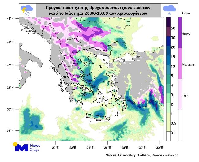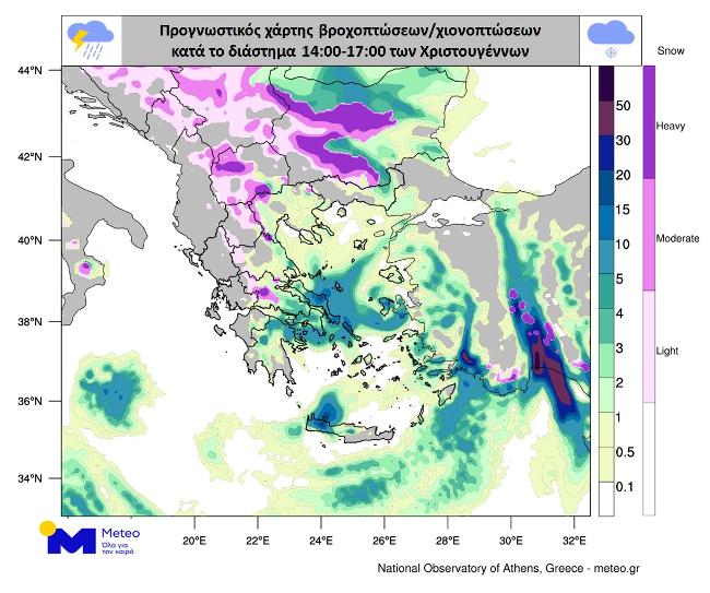 Στους προγνωστικούς χάρτες που ακολουθούν αποτυπώνεται με μπλε αποχρώσεις η εκτιμώμενη κατανομή των βροχοπτώσεων και με ροζ αποχρώσεις η εκτιμώμενη κατανομή των χιονοπτώσεων. Οι χάρτες αναφέρονται στα διαστήματα Χριστούγεννα 14:00 – 17:00, Χριστούγεννα 20:00 – 23:00 και Πέμπτη 26/12, 05:00 – 08:00.
