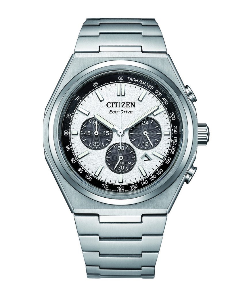 Χρονογράφος με κάσα 42,5 mm και μπρασελέ από τιτάνιο, μηχανισμό ηλιακής φόρτισης Eco-Drive με 270 ημέρες αυτονομίας, στεγανός μέχρι 100 μέτρα βάθος. Τιμή: €529 (PAC TIME International)