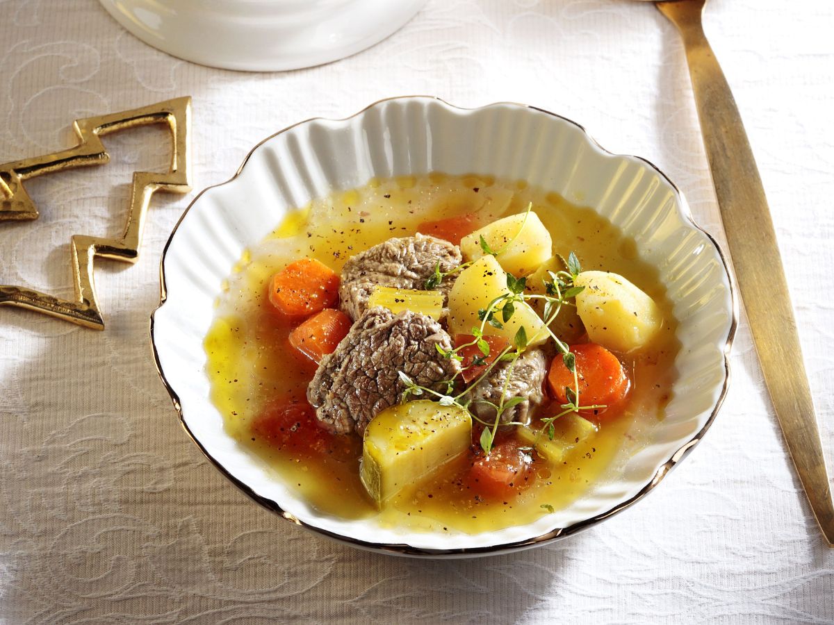 Σερβίρουμε σε βαθιά πιάτα 4-5 κομμάτια μοσχάρι και ρίχνουμε από πάνω μια γενναία κουταλιά από τη σούπα με τα λαχανικά.