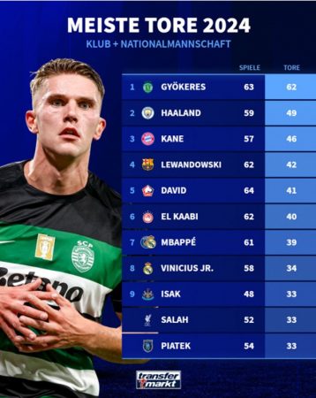 Στην κορυφή βρίσκεται ο Σουηδός διεθνής επιθετικός της Σπόρτινγκ Λισαβόνας, Βίκτορ Γκιόκερες, ο οποίος σκόραρε 62 φορές σε 63 παιχνίδια, για την ομάδα της Λισαβόνας και την εθνική ομάδα, αριθμοί που τον καθιστούν ως τον πιο επιτυχημένο σκόρερ πέρυσι. Για τη Σπόρτινγκ, ο Γκιόκερες σημείωσε 52 γκολ σε 56 αγώνες και βοήθησε τον σύλλογό του στο 20ο πρωτάθλημα. Με τη φανέλα της Σουηδίας, ο Γκιόκερες σημείωσε 10 γκολ σε επτά παιχνίδια και έπαιξε σημαντικό ρόλο στην άνοδο στο Nations League B. Η χρηματιστηριακή του αξία ανέβηκε από 45 σε 75 εκατομμύρια ευρώ το 2024.