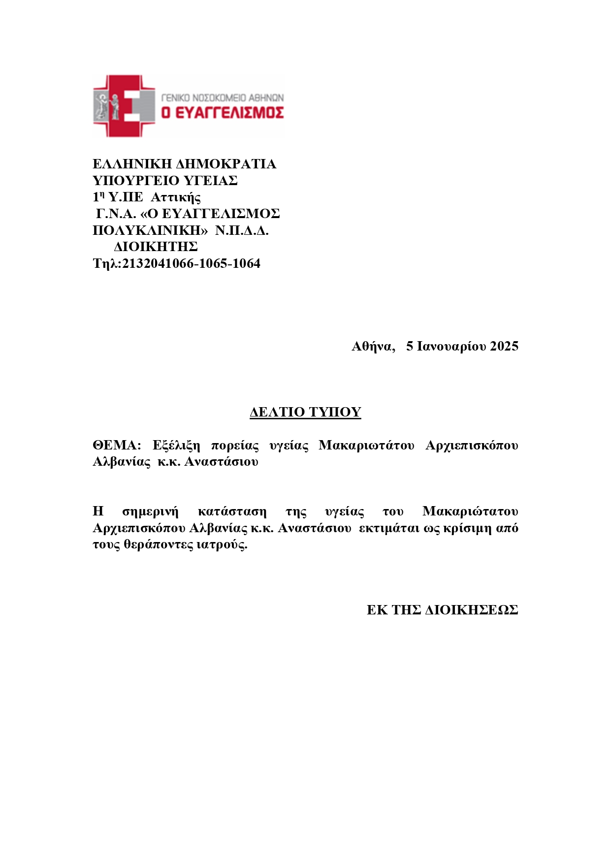 «Η σημερινή κατάσταση του Μακαριώτατου Αρχιεπισκόπου Αλβανίας κ.κ. Αναστάσιου εκτιμάται ως κρίσιμη από τους θεράποντες ιατρούς», επισημαίνεται στο ιατρικό ανακοινωθέν από τον Ευαγγελισμό.