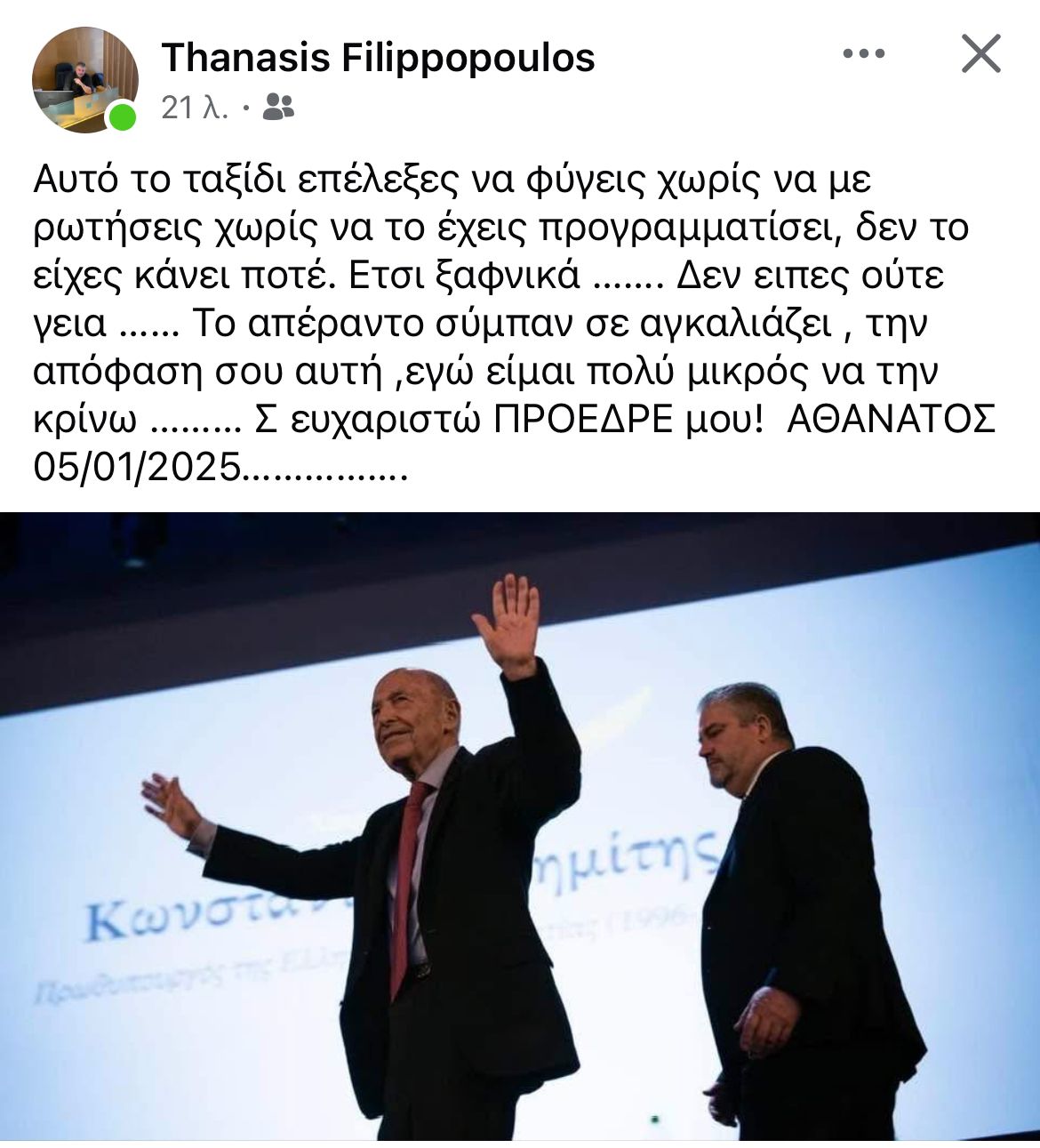 «Δεν είπες ούτε γεια… Το απέραντο σύμπαν σε αγκαλιάζει, την απ;oφασή σου αυτή, εγώ είμαι πολύ μικρός να την κρίνω… Σ’ ευχαριστώ ΠΡΟΕΔΡΕ μου! ΑΘΑΝΑΤΟΣ 05/01/2025…» καταλήγει.