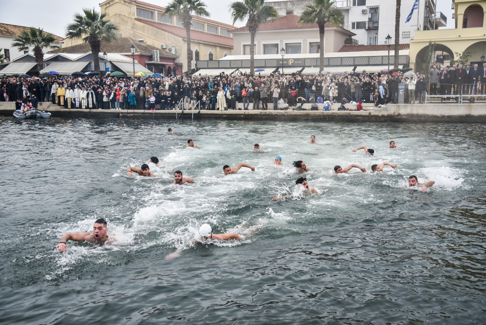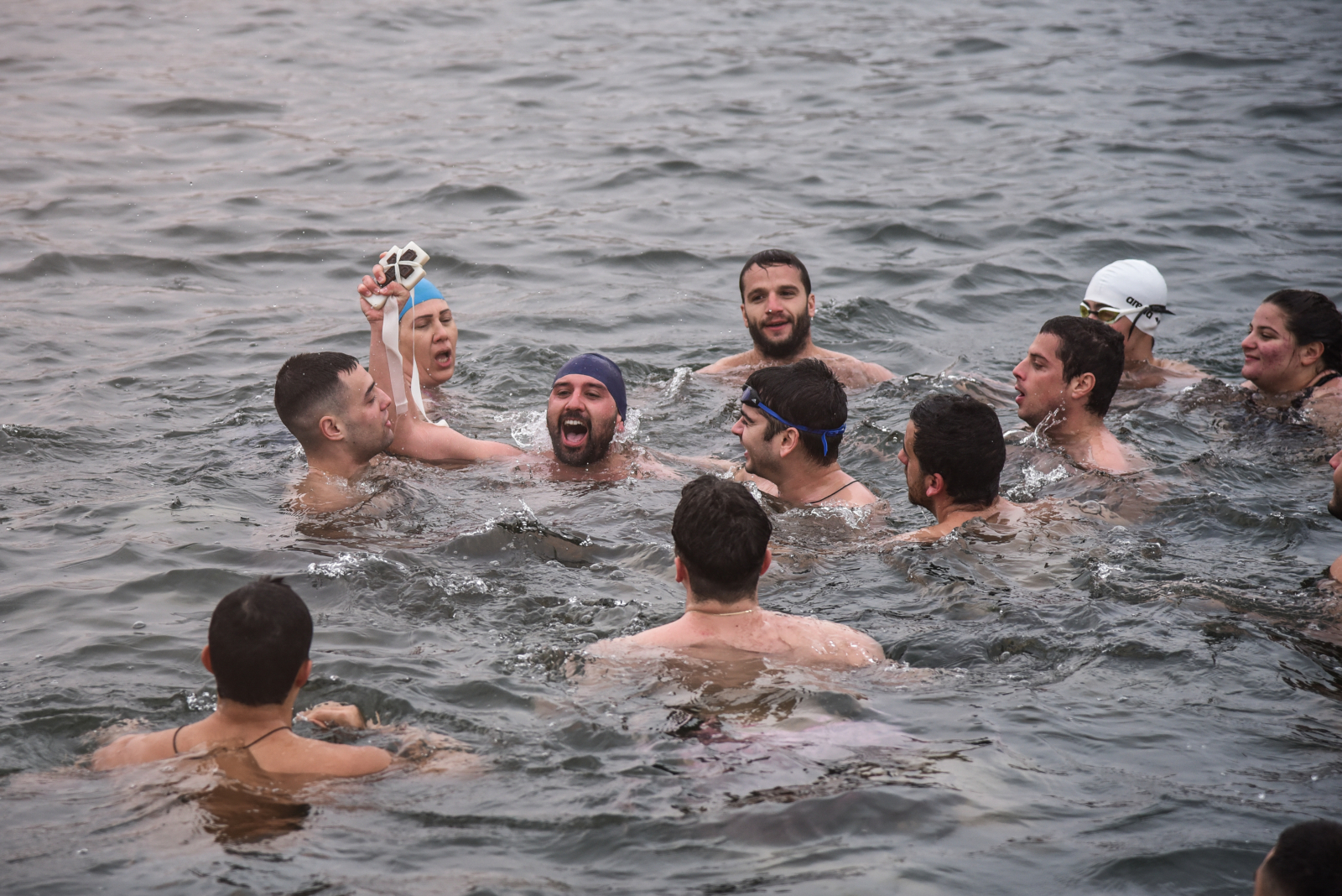 Μέλη του συνδέσμου ελλήνων βατραχανθρώπων βούτηξαν στα παγωμένα νερά του λιμανιού για να πιάσουν τον τίμιο σταυρό.