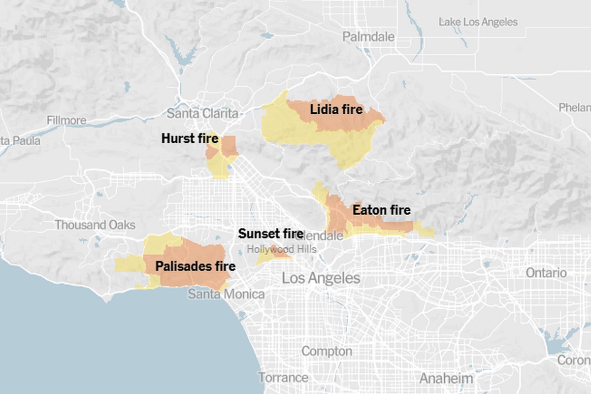 Τις Αρχές απασχολούν κυρίως δύο μέτωπα. Η πυρκαγιά Palisades μεταξύ της Σάντα Μόνικα και του Μαλιμπού στη δυτική πλευρά της πόλης και η πυρκαγιά Eaton στα ανατολικά κοντά στην Πασαντίνα. Αυτές είναι και οι πιο καταστροφικές φωτιές στην ιστορία του Λος Άντζελες, καίγοντας μέχρι στιγμής σχεδόν 28.000 στρέμματα (στις συγκεκριμένες περιοχές, 65.000 συνολικά) και μετατρέποντας ολόκληρες γειτονιές σε στάχτη.