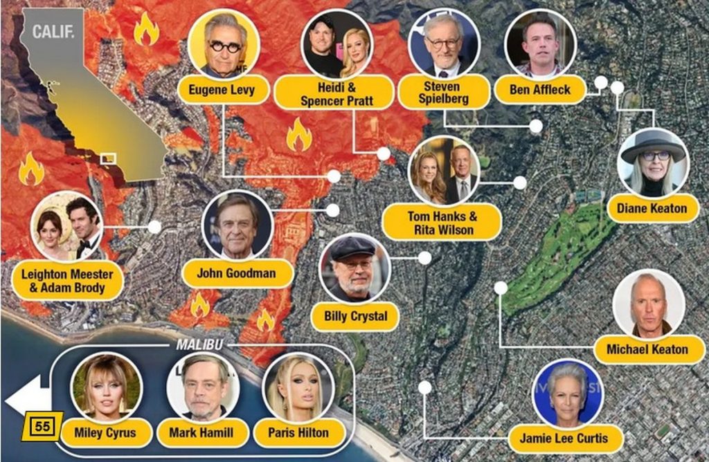 Ανάμεσα σε αυτούς που είδαν τα σπίτια τους να γίνονται στάχτη ήταν ο ηθοποιός και σκηνοθέτης Μελ Γκίμπσον, που δήλωσε στο NewsNation συντετριμμένος διότι το σπίτι του καταστράφηκε στο Μάλιμπου, καθώς και ο επί σειρά ετών παίκτης του NBA, του επαγγελματικού πρωταθλήματος μπάσκετ των ΗΠΑ, και σήμερα προπονητής των Λέικερς του Λος Άντζελες, ο Τζέι-Τζέι Ρέντικ.
