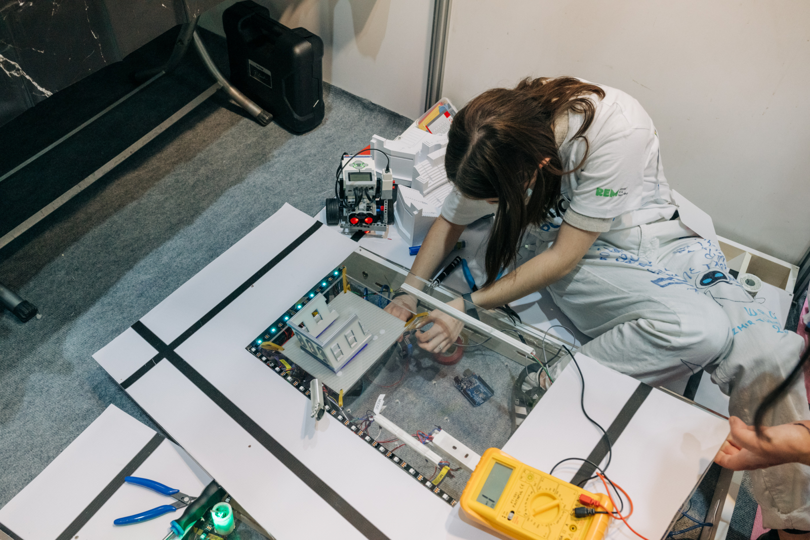 Δεν χρειάστηκαν παρά λίγα λεπτά και μια σύντομη βόλτα στα ελληνικά περίπτερα της κατηγορίας Future Innovators Γυμνασίου και Λυκείου για να αντιληφθούμε με ποιον τρόπο τα παραπάνω λόγια μετουσιώνονται σε βιωμένη εμπειρία. Τρεις έφηβες μαθήτριες από το 1ο Πειραματικό Λύκειο Νέας Ιωνίας Βόλου αποσυναρμολογούν μέρος της αυτοσχέδιας και πρωτότυπης πίστας που έχουν κατασκευάσει για να επιδιορθώσουν ένα τεχνικό πρόβλημα της τελευταίας στιγμής. Σε λίγη ώρα, όταν και θα περάσουν οι κριτές θα πρέπει να λειτουργούν όλα άψογα. Η ομάδα τους λέγεται REM (Robot Ex Machina) και πρόκειται να παρουσιάσει ένα ρομπότ, το οποίο μπορεί να προσεγγίζει άμεσα περιοχές που έχουν πληγεί από φυσικές καταστροφές και να εντοπίζει επιζώντες στις κρίσιμες πρώτες ώρες.