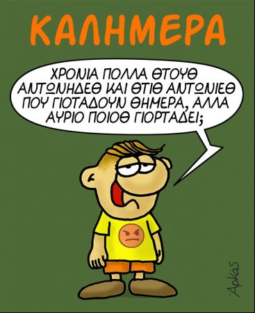 – Χρόνια πολλά θτουθ Αντώνηδεθ και θτιθ Αντωνίεθ που γιοτάδουν θήμερα, αλλά αύριο ποιοθ γιορτάδει;