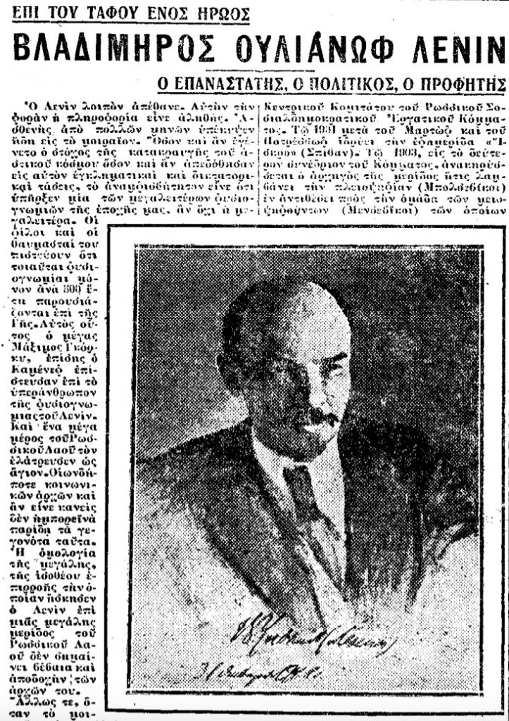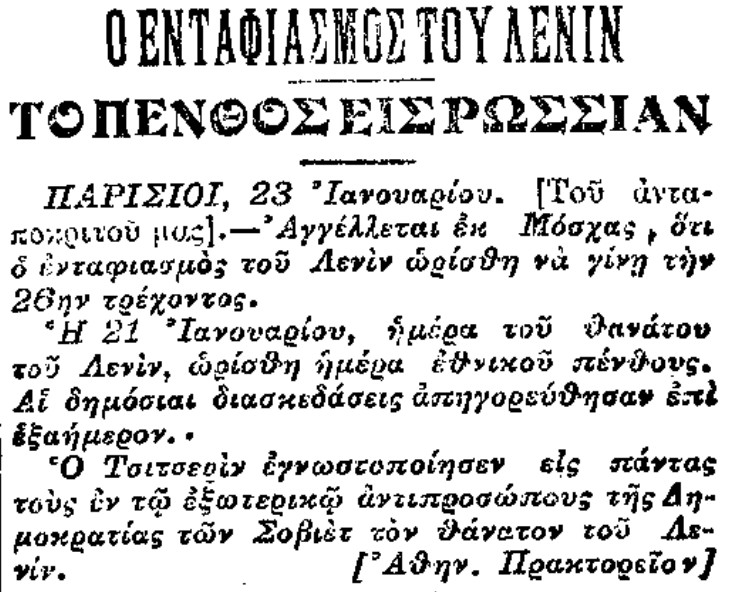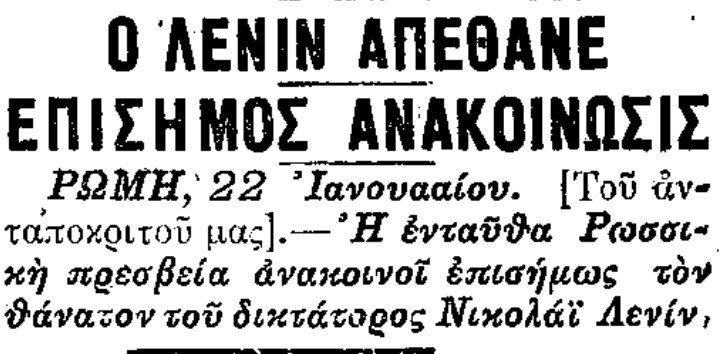 «Ο Λένιν λοιπον απέθανε. Αυτήν την φοράν η πληροφορία είναι αληθής. Ασθενής από πολλών μηνών υπέκυψεν ήδη εις το μοιραίον