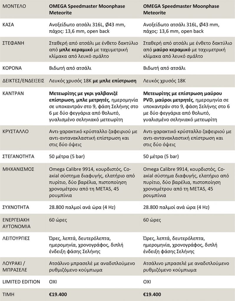 Τα δύο νέα μέλη της «διαστημικής» οικογένειας της Omega είναι από ανοξείδωτο ατσάλι, σε διάμετρο 43 χιλιοστά και το καθένα έχει διαφορετικό είδος μετεωρίτη στην πρόσοψή του. Πρόκειται για μετεωρίτη σιδήρου, τον οποίο μάλιστα η ελβετική εταιρεία χρωμάτισε είτε με επίστρωση μαύρου PVD είτε με γαλβανιζέ γκρι επίστρωση.Η ιδιαιτερότητα των δύο χρονογράφων Speedmaster Moonphase Meteorite όμως δεν περιορίζεται στο υλικό της πλάκας. Χάρη στον πρωτοποριακό Omega Calibre 9914, στο κάτω τμήμα του καντράν δεσπόζει μία διπλή ένδειξη φάσης της Σελήνης. Διπλή καθώς έχει δύο φεγγάρια, τα οποία απεικονίζουν τον σεληνιακό κύκλο όπως φαίνεται τόσο από το βόρειο όσο και από το νότιο ημισφαίριο της Γης.