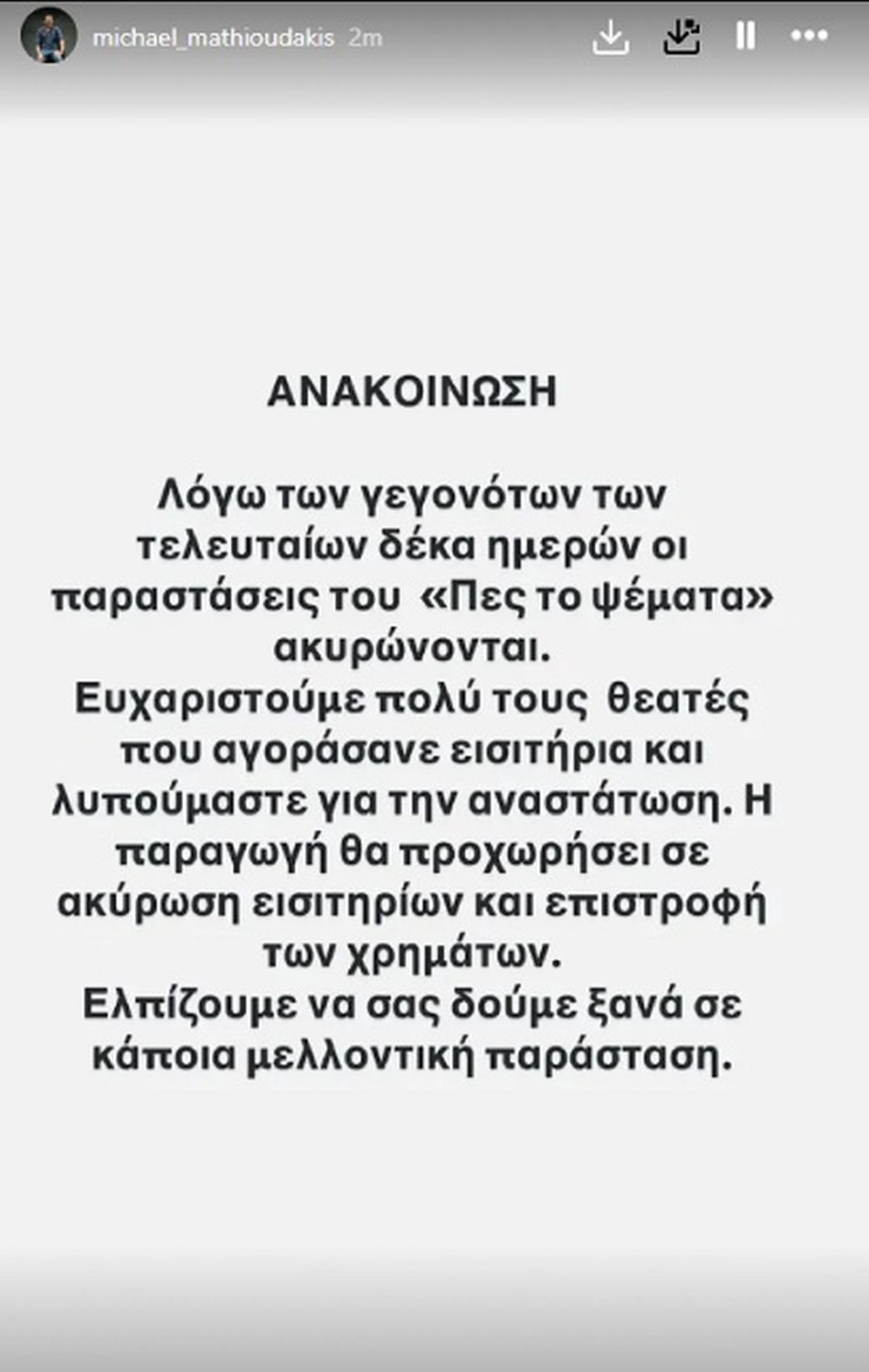 «Λόγω των γεγονότων των τελευταίων ημερών οι παραστάσεις του “Πες το Ψέματα” ακυρώνονται. Ευχαριστούμε πολύ του θεατές που αγόρασαν εισιτήρια και λυπούμαστε για την αναστάτωση. Η παραγωγή θα προχωρήσει σε ακύρωση εισιτηρίων και επιστροφή χρημάτων. Ελπίζουμε να σας δούμε ξανά σε κάποια μελλοντική παράσταση» αναφέρει η ανακοίνωση.