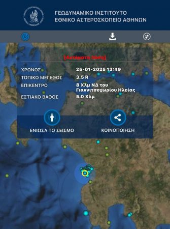 Σεισμός μεγέθους 3,6 της κλίμακας Ρίχτερ σημειώθηκε σήμερα το μεσημέρι, Σάββάτο 25 Ιανουαρίου 2025, στο Γιαννιτσοχώρι Ηλείας και συγκεκριμένα στις 13.49.