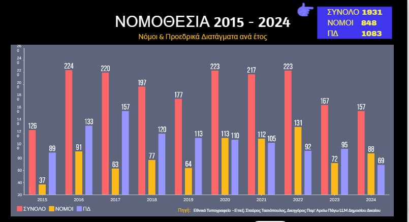 Εξετάζοντας τα προηγούμενα 10 έτη, προκύπτει ότι στη χώρα μας η παραγωγή νομοθεσίας ήταν σε μια αδιάκοπη λειτουργία με την ψήφιση 848 νόμων και την έκδοση 1.083 προεδρικών διαταγμάτων, δηλαδή συνολικά 1.931 νομοθετημάτων που ρυθμίζουν τη λειτουργία του κράτους και άπτονται όλων των πεδίων διακυβέρνησης.